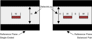 圖 11-1 微帶拓?fù)?/span>帶狀線是兩個(gè)接地平面之間的布線(請(qǐng)參閱圖 11-2)。帶狀線不易產(chǎn)生輻射和易感性問(wèn)題,因?yàn)榛鶞?zhǔn)平面有效地屏蔽了嵌入的布線。但是,從高速傳輸?shù)慕嵌葋?lái)看,將兩個(gè)平面并置會(huì)產(chǎn)生額外的電容。TI 建議盡可能在微帶傳輸線路上路由 M-LVDS 信號(hào)。利用 PCB 布線,設(shè)計(jì)人員可以根據(jù)整體噪聲預(yù)算和反射容差指定 Z O 的必要容差。腳注 11、22 和 33 提供了差分和單端布線的 ZO 和 tPD 公式的文檔。(2)(3)(4)