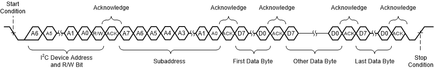 順序數(shù)據(jù)寫入傳輸與單字節(jié)數(shù)據(jù)寫入傳輸完全相同,唯一的例外是控制器將多個數(shù)據(jù)字節(jié)傳輸?shù)狡骷?,?圖 7-26 所示。接收到每個數(shù)據(jù)字節(jié)后,器件會以一個應(yīng)答位進行響應(yīng),并且 I2C 子地址會自動遞增 1。