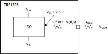 圖 7-1 顯示了輸出共??刂频墓δ軋D。在內(nèi)部,VOCM 引腳通過 2.5kΩ 電阻連接到等于 VS– + 2.5V 的 LDO 輸出電壓。