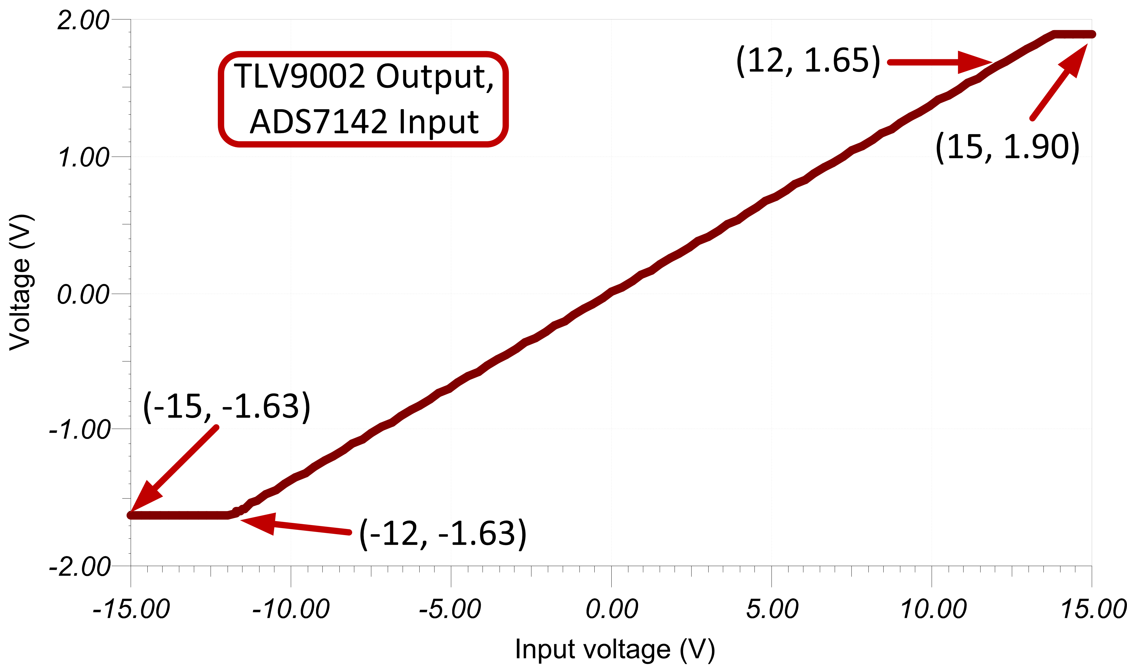 ?? ???? ±15V ?? ???? ISO224?? TLV9002 ? ADS7142? ?????? ??? ?????. ISO224? ±VIN/3? ?? ??? ????, ? ?? ????? TLV9002? ?? ??? ? ? ????. ? ?? ???? TLV9002? VIN/2.43?? ??? ?? ??? ?? ??? 1.665V? ???? ?????. ??? AVDD = VREF = 3.3V? ADC? 0V~3.3V ?? ?? ??(FSR)? ??? ?? ?? ?? ±12V ?? ??? ?? ? ????.