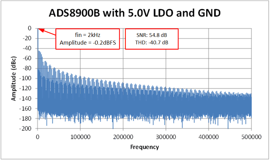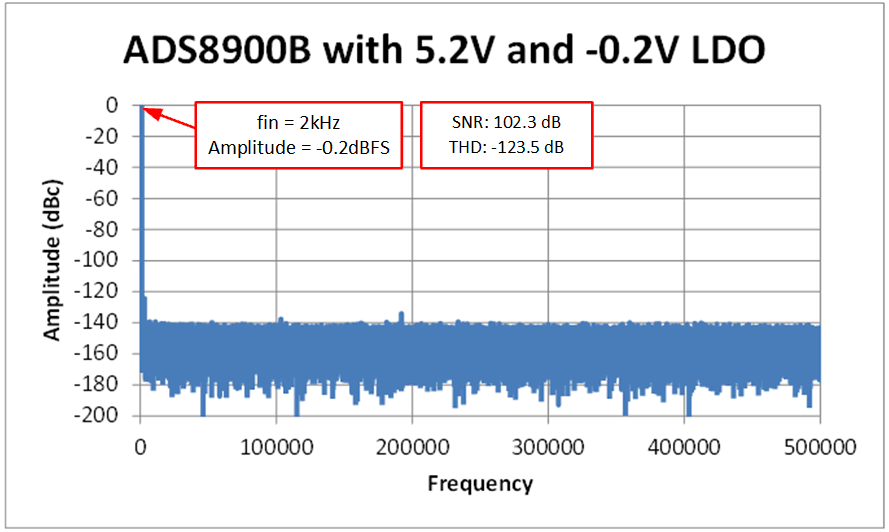 下面的 FFT 是用非常接近滿標(biāo)量程 ±5V (–0.2dBFS) 的輸入信號(hào)測出的。請(qǐng)注意,與電源調(diào)節(jié)至 5V 和 GND 的情況相比,SNR 和 THD 非常良好。注意 TPS7A3901 是產(chǎn)生線性 –0.2V 電源的便捷方式。