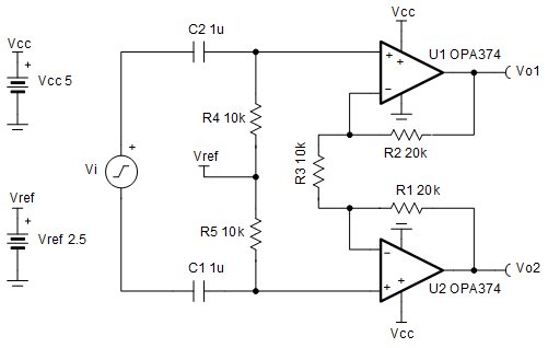 此電路使用兩個(gè)運(yùn)算放大器構(gòu)建分立式單電源差分輸入差分輸出放大器。電路將差分信號(hào)轉(zhuǎn)換為差分輸出信號(hào)。