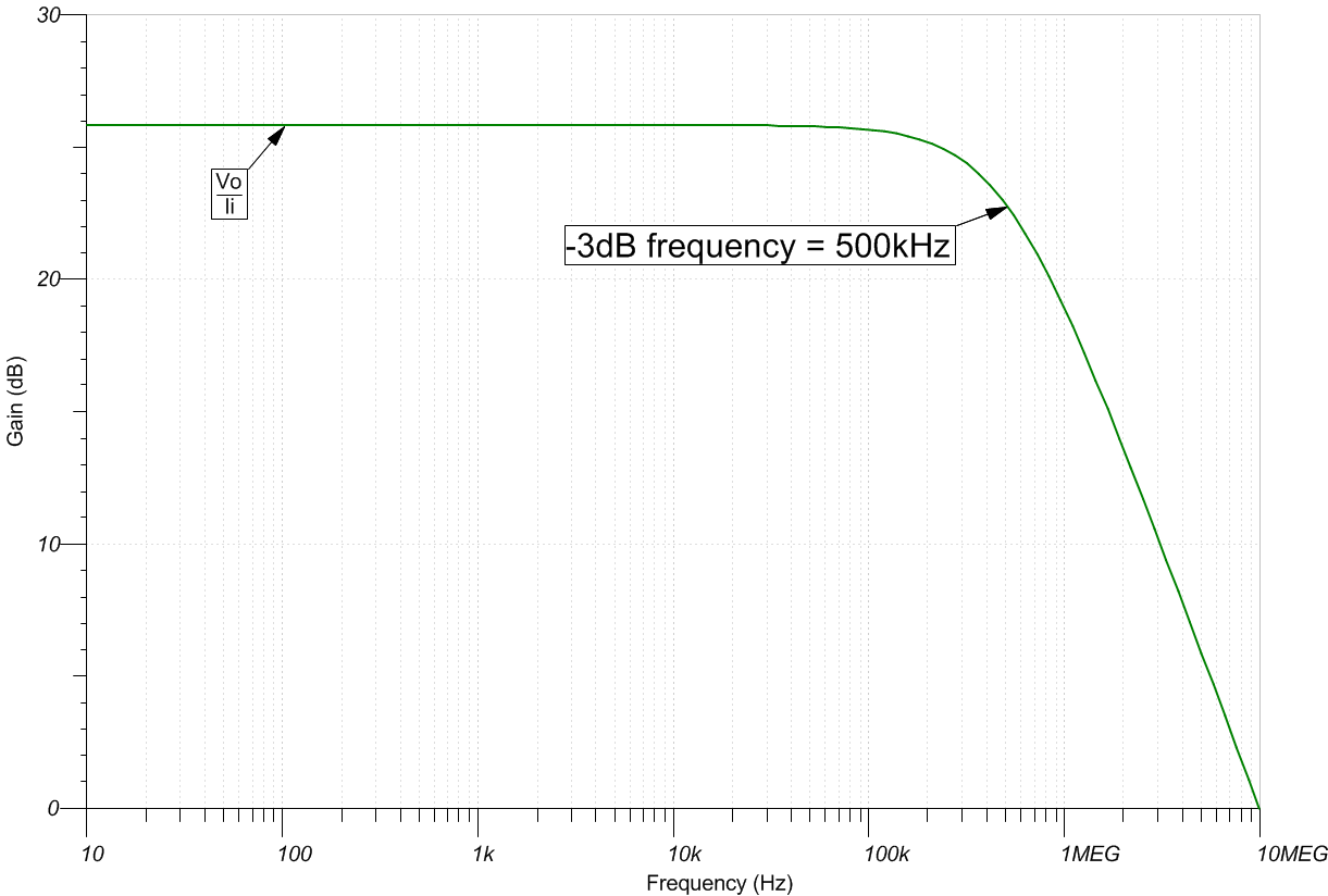 - 此電路的小信號(hào)帶寬取決于電路的增益和放大器的增益帶寬積 (GBP)。