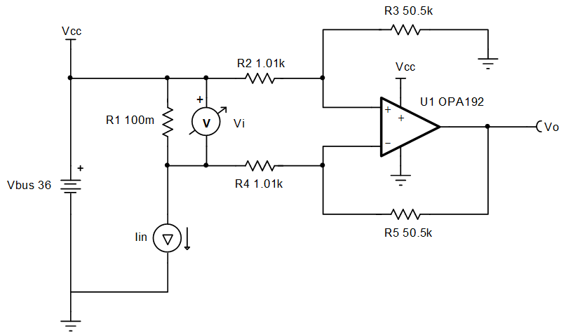 - 驗(yàn)證共模電壓是否處于放大器的線性輸入運(yùn)行區(qū)域內(nèi)。共模電壓由 R2、R3 構(gòu)成的電阻分壓器和總線電壓設(shè)置。根據(jù)電阻分壓器確定的共模電壓,此應(yīng)用可能不需要軌到軌輸入 (RRI) 放大器。