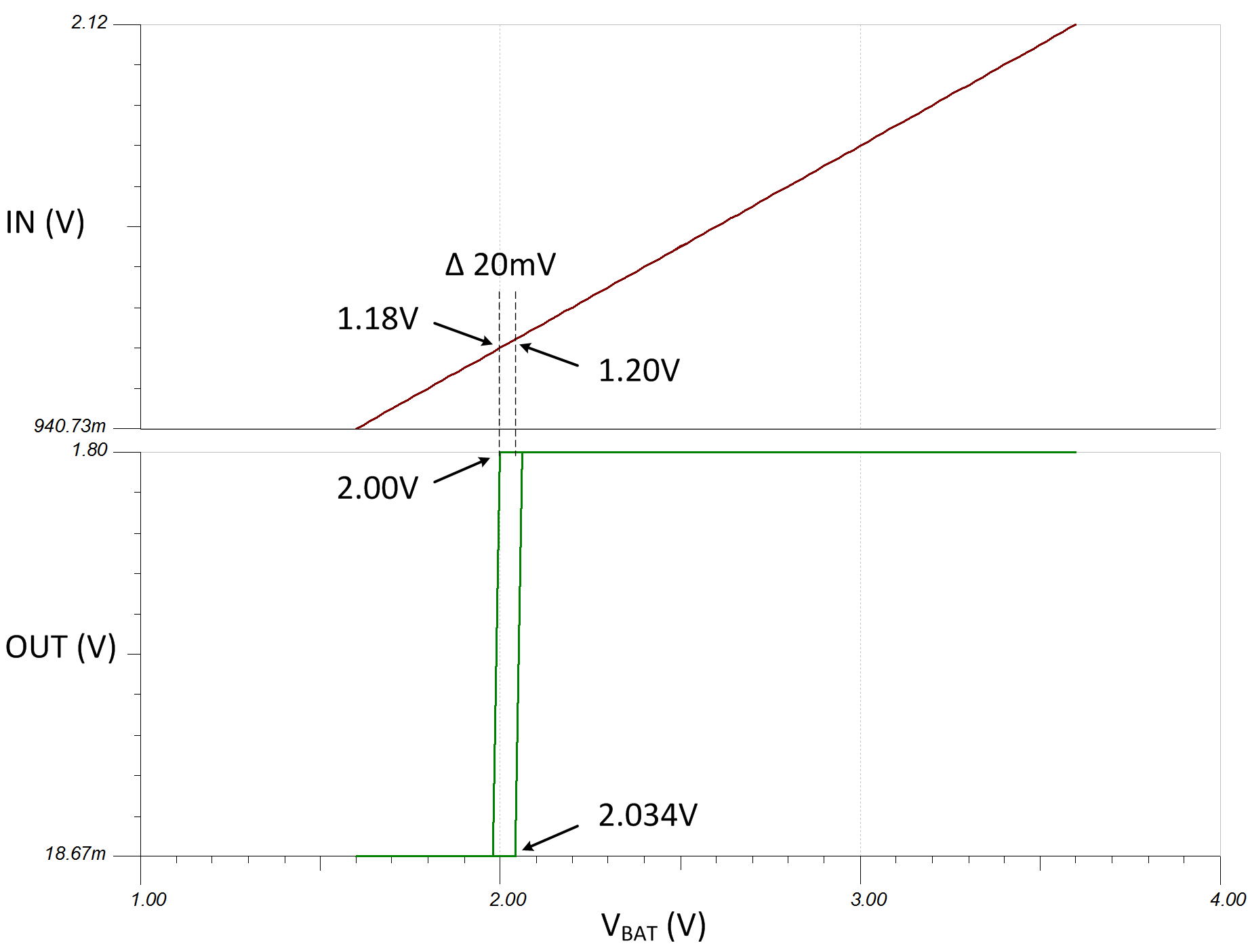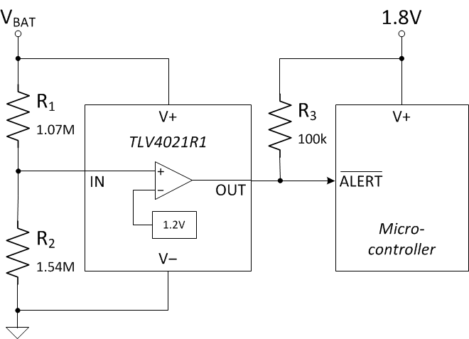 - 計(jì)算所需的電阻分壓器分壓比,以便在 VBAT 降至 2.0V 的目標(biāo)欠壓電平 (VLOW) 時(shí)比較器的輸入超過(guò) VIT-。TLV4021R1 數(shù)據(jù)表中的 VIT- 為 1.18V。