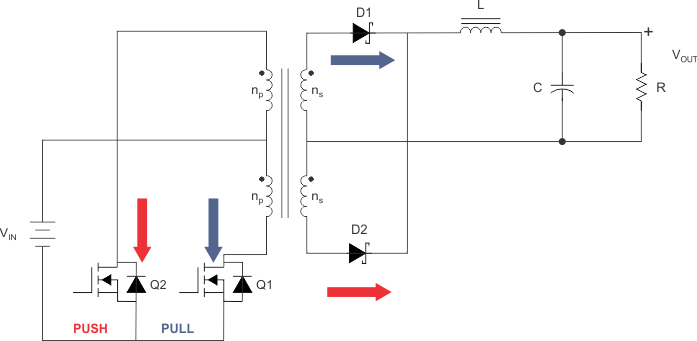 圖 3-1 推挽式拓?fù)?/span>大致說來,推挽式拓?fù)渚哂袃蓚€初級的正激式轉(zhuǎn)換器。初級開關(guān)交替為其各自的繞組供電。當(dāng) Q1 激活時,電流將流過 D1。當(dāng) Q2 激活時,電流將流過 D2。圖 3-1次級以中心抽頭的配置形式排列,如 所示。輸出濾波器具有 Q1 或 Q2 兩倍的開關(guān)頻率。傳遞函數(shù)類似于正激式轉(zhuǎn)換器,其中“D”是給定初級開關(guān)的占空比,這便是所謂“2X”的來源。當(dāng) Q1 和 Q2 均未激活時,輸出電感器電流在兩個輸出二極管之間分流。