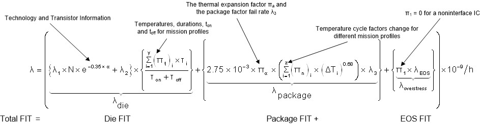 可將 IEC TR 62380 IC 故障率建模為內(nèi)核、封裝和電氣過應(yīng)力 (EOS) 相關(guān)故障率的總和,其中: