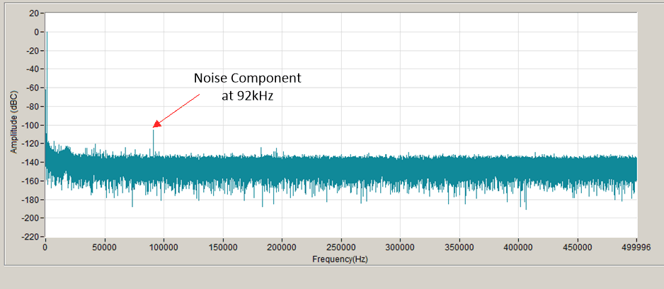 以下 FFT 圖顯示了使用 LM7705 器件生成 –0.232V 電源的情況下,測(cè)得的 OPA320 運(yùn)算放大器(驅(qū)動(dòng) ADS8860 SAR ADC)的性能。這里的關(guān)鍵點(diǎn)是,在 92kHz 處可以觀察到開關(guān)電容反相器信號(hào)的噪聲。該噪聲相對(duì)較低,并且對(duì)器件的 SNR 和 THD 影響很小。