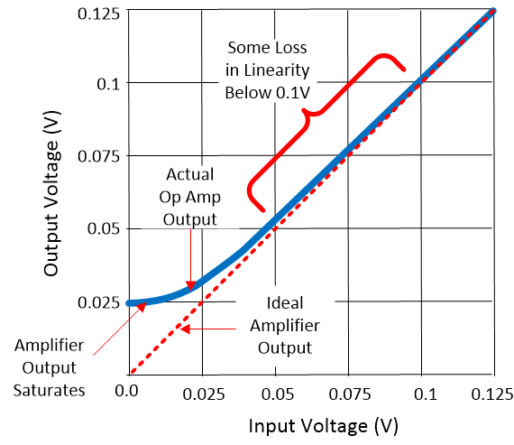 下圖展示了當(dāng)輸出接近 0V 時(shí),典型單電源 CMOS 運(yùn)算放大器的輸出擺幅限制。請(qǐng)注意,該放大器在距離負(fù)電源軌約 0.1V 處變?yōu)榉蔷€性。此外,請(qǐng)注意,輸出在距離負(fù)電源軌 0.25V 處飽和(或削波)。使用一個(gè)小型負(fù)電源 (-0.232V) 即可消除該問題,并且輸出呈現(xiàn)為理想曲線。