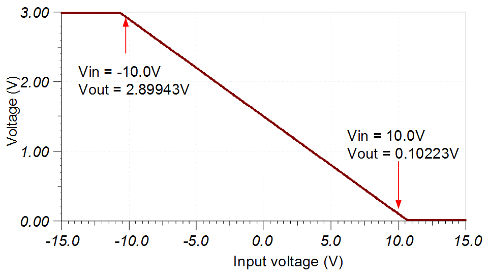 下圖所示為 –10V 至 10V 輸入的線性輸出響應。在這種情況下,對于 –10V 輸入,放大器輸出約為 2.9V,對于 +10V 輸入,放大器輸出則約為 0.1V。該設計經(jīng)過調(diào)整,使輸出范圍距離非線性電源軌具有 0.1V 的安全距離。有關該主題的詳細理論信息,請參閱使用儀表放大器確定 SAR ADC 的線性范圍 視頻。