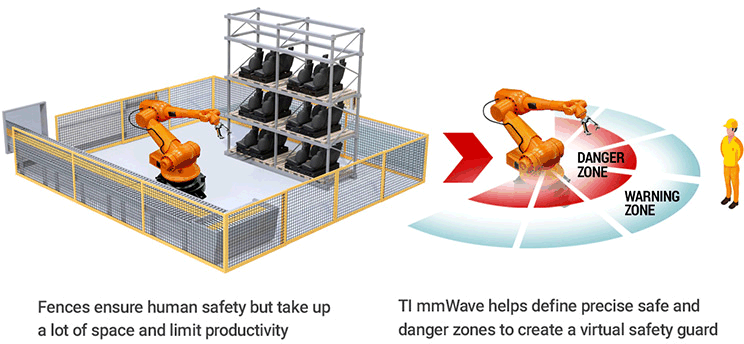 一家工業(yè)公司最近聯(lián)系 TI,希望在其工廠升級(jí)過程中采用虛擬安全防護(hù)解決方案。為了在不影響人員安全的前提下盡可能縮短工業(yè)機(jī)器人的周期時(shí)間,他們希望在有人員出現(xiàn)時(shí)將機(jī)器人的運(yùn)行速度降低到安全范圍內(nèi),而不是讓機(jī)器人完全停止。