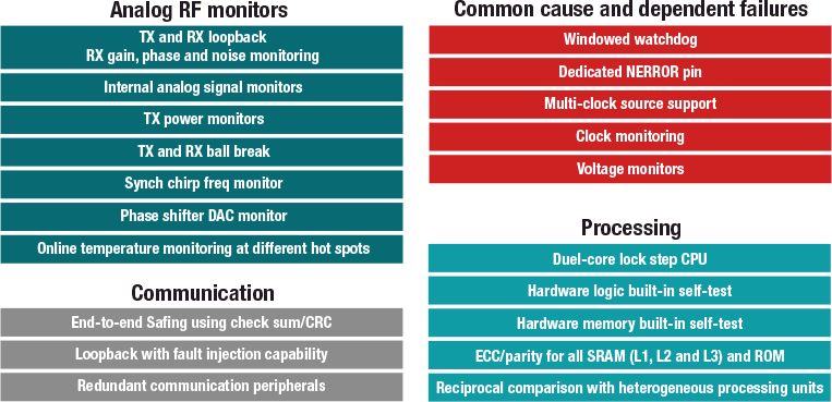 這種非接觸式傳感器解決方案必須實(shí)現(xiàn)功能安全,才能幫助更大程度降低與可能導(dǎo)致人身傷害、環(huán)境污染或財(cái)產(chǎn)損失的潛在危險(xiǎn)故障相關(guān)的風(fēng)險(xiǎn)。TI 設(shè)計(jì)的毫米波雷達(dá)傳感器可幫助解決此類難題。從功能安全的角度來看,TI 在開發(fā) IWR6843 等毫米波器件之前,已進(jìn)行了大量的硬件和軟件開發(fā)工作,并獲得了 Technischer überwachungsverein (TüV) SüD 的器件認(rèn)證。如圖 2 所示,IWR6843 傳感器還內(nèi)置多種功能安全機(jī)制,這些機(jī)制提供國際電工委員會(huì) 61508 所要求的必要診斷覆蓋范圍,可在元件級(jí)別滿足高達(dá)安全完整性等級(jí) (SIL) 2 的隨機(jī)硬件功能。