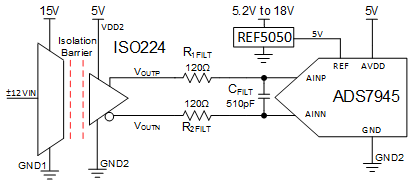 | ISO224 輸入電壓 | ISO 輸出、ADC 輸入 (VOUTP - VOUTN) | 數(shù)字輸出 ADS7945 |