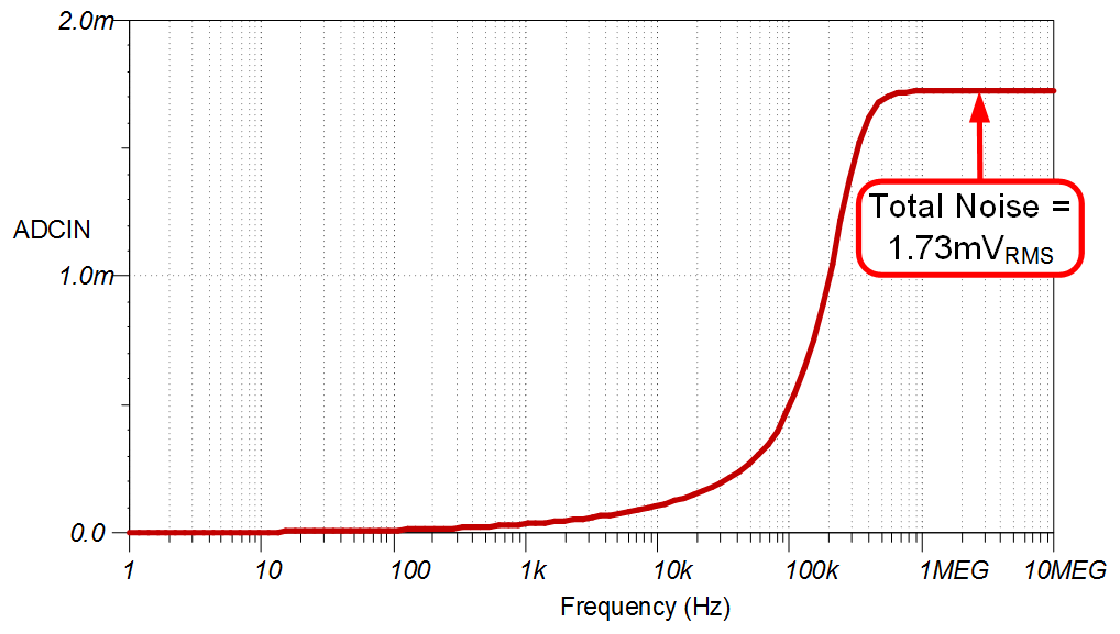 仿真噪聲高于預(yù)期的計算噪聲。此差異是由仿真模型中的噪聲峰值造成。計算中未包括噪聲峰值。請參閱計算 ADC 系統(tǒng)的總噪聲 了解有關(guān)此主題的詳細(xì)理論。