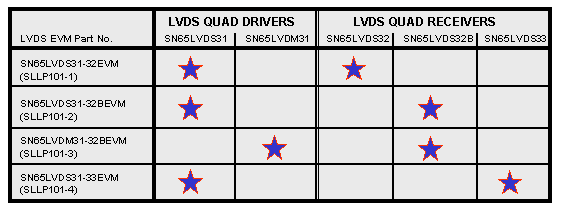 TI offers a series of low-voltage differential signaling (LVDS) evaluation modules (EVMs) designed for analysis of the electrical characteristics of LVDS drivers and receivers. Four unique EVMs are available to evaluate the different classes of LVDS devices offered by TI.