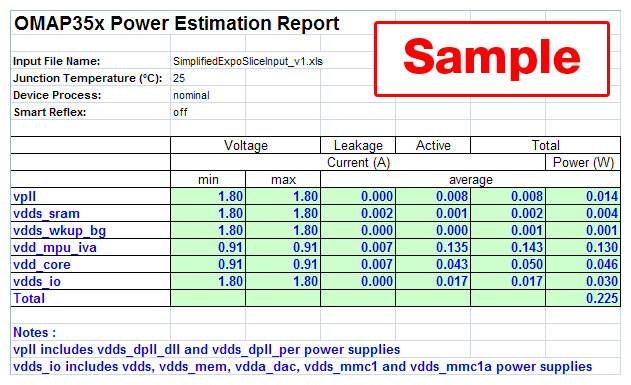第 1 步:下载输入电子表格并填写。 对于 OMAP35x 处理器: 下载 OMAP35x 简化电子表格下载 OMAP35x 高级电子表格 对于 AM35x 处理器: 下载 AM35x 简化电子表格下载 AM35x 高级电子表格 对于 AM335x/AMIC 处理器: 下载 AM335x 简化电子表格下载 AM335x 高级电子表格 | 第 2 步:上传电子表格。 | 第 3 步:功耗估算报告将通过电子邮件发送给您。 |