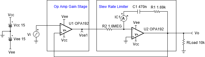 該電路可控制模擬增益級的壓擺率。該電路適用于對稱的壓擺率應用。與選擇用來實施壓擺率限制器的運算放大器相比,所需的壓擺率必須更慢一些。