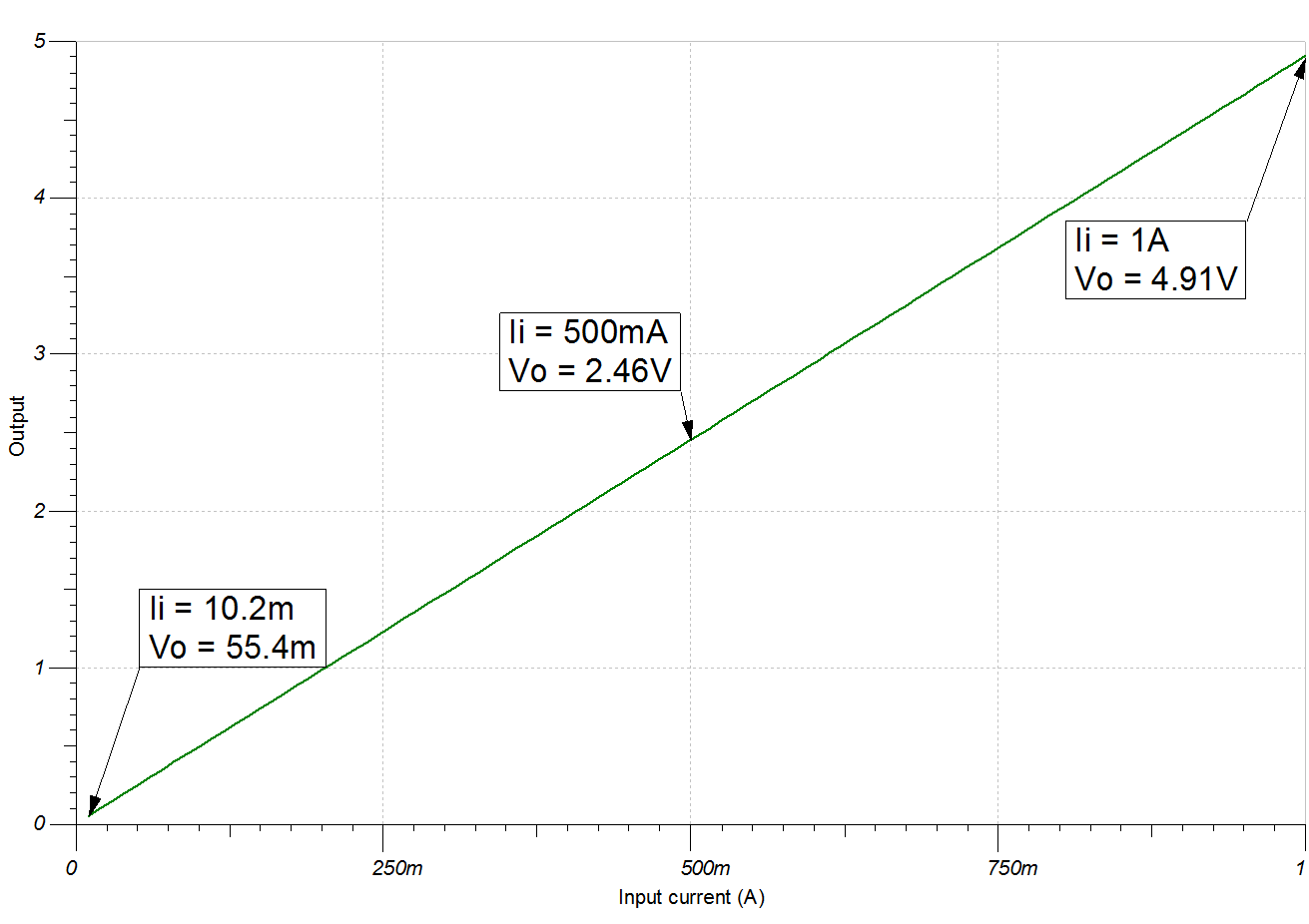 此單電源低側電流檢測方法可以準確地檢測最大為 1A 的負載電流,并將其轉換為 50mV 至 4.9V 的電壓。可以根據需要調節輸入電流范圍和輸出電壓范圍,并且可以使用更大的電源來適應更大的擺幅。