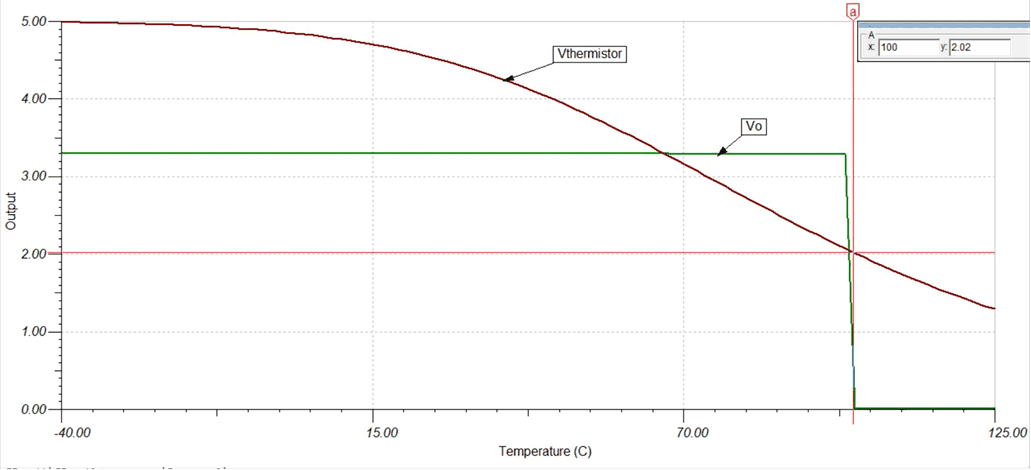 - 選擇 R1。對(duì)于高溫開(kāi)關(guān)點(diǎn),R1 應(yīng)小于熱敏電阻標(biāo)稱電阻的十分之一。這會(huì)導(dǎo)致溫度開(kāi)關(guān)點(diǎn)周圍的每次溫度變化產(chǎn)生較大的電壓差,這有助于保證輸出在所需的溫度值進(jìn)行開(kāi)關(guān)。