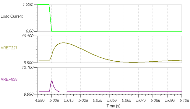 當 DAC 更改代碼時,基準緩沖器必須能夠快速提供 R-2R 電阻梯所需的瞬態電流。鑒于 DAC8871 的架構,當 DAC 從零或滿標度代碼轉換為中標度時,會出現最大瞬態電流。可以使用 VREFH 和 VREFL 輸入之間的電流源來對該瞬變進行仿真。以下仿真顯示了使用 OPA828 和 OPA227 仿真的電流瞬態期間的差分基準電壓。這表明 OPA828 降低了基準誤差幅度和持續時間。