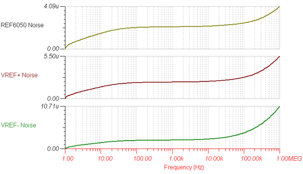 電路產生的總噪聲如以下仿真所示。基準、反相放大器和基準緩沖器均會導致噪聲。請注意,由于反相放大器及其反饋網絡中分立式電阻器的作用,VREF- 輸入具有更大的噪聲。
