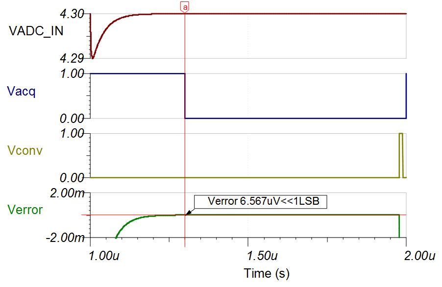 以下仿真顯示了趨穩至 10V 直流輸入信號(ADC 差分輸入信號 +4.3V)的情況。該類型的仿真表明已正確選擇采樣保持反沖電路。如需了解該主題的詳細理論,請參閱最終 SAR ADC 驅動器仿真。