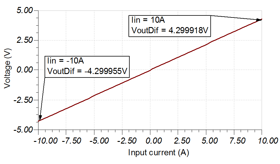 下圖展示了 –10A 至 +10A 輸入的線性輸出響應。