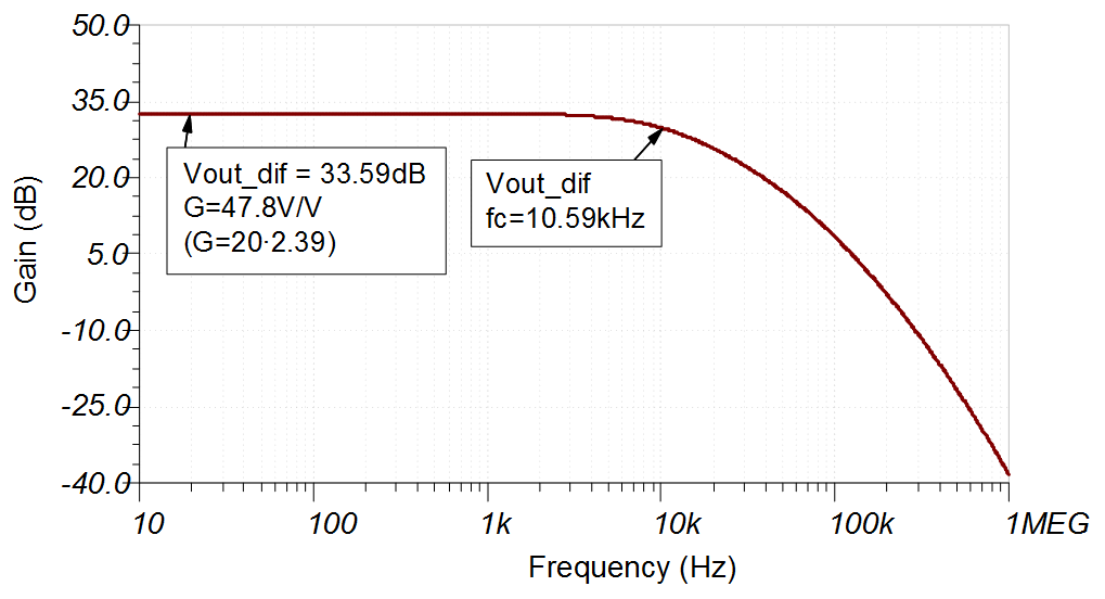 帶寬被仿真為 10.5kHz,增益為 32.66dB,這意味著 43V/V 的線性增益 (G = 20×2.15V/V)。