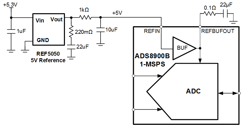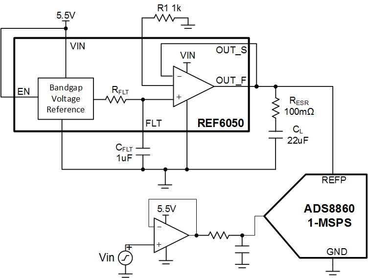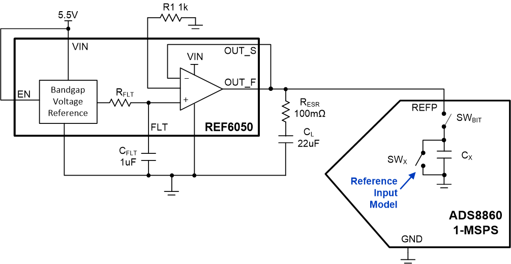 部分?jǐn)?shù)據(jù)轉(zhuǎn)換器具有內(nèi)部寬帶寬緩沖器,旨在驅(qū)動(dòng)開(kāi)關(guān)電容器基準(zhǔn)輸入。此緩沖器的輸入為高阻抗,因此該基準(zhǔn)不需要寬帶寬輸出。ADS8900B 和 ADS8168 器件是集成寬帶寬基準(zhǔn)緩沖器的數(shù)據(jù)轉(zhuǎn)換器示例。