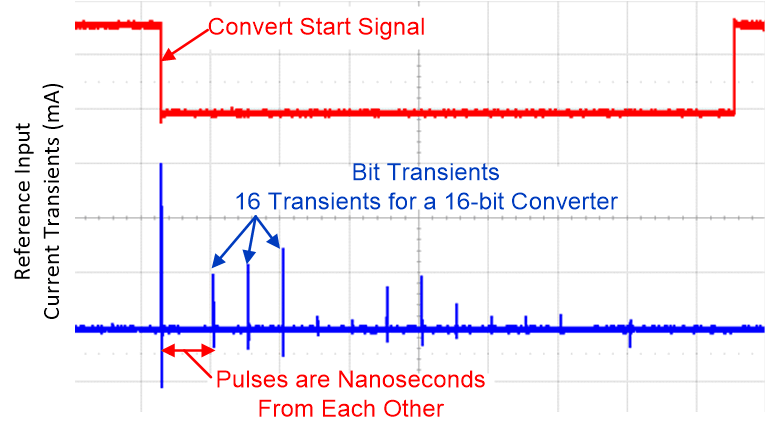 許多不同的數(shù)據(jù)轉(zhuǎn)換器都具有開(kāi)關(guān)電容器基準(zhǔn)輸入。下圖展示了此輸入的一個(gè)簡(jiǎn)化模型。該模型適用于傳統(tǒng)的 SAR ADC,但某些 Δ-Σ 轉(zhuǎn)換器也存在類似的模型。在本例中,電容 Cx 通過(guò) SWBIT 連接并斷開(kāi)外部基準(zhǔn)。該電容器在斷開(kāi)連接后,通過(guò) SWx 進(jìn)行復(fù)位。對(duì)于 N 位轉(zhuǎn)換器,此過(guò)程會(huì)重復(fù) N 次。這在每次電容器連接到基準(zhǔn)時(shí)都會(huì)產(chǎn)生較大的瞬態(tài)輸入電流。瞬態(tài)幅度可能為毫安級(jí),而瞬態(tài)之間的時(shí)間間隔為納秒級(jí)。Cx 的值在轉(zhuǎn)換周期內(nèi)會(huì)不斷變化,因此瞬態(tài)幅度會(huì)發(fā)生變化(請(qǐng)參閱下面的基準(zhǔn)輸入圖)。為了獲得精確的轉(zhuǎn)換結(jié)果,基準(zhǔn)電壓必須能夠快速響應(yīng)這些瞬態(tài)。因此,該基準(zhǔn)需要寬帶寬緩沖器來(lái)實(shí)現(xiàn)超高精度。大多數(shù)基準(zhǔn)都具有內(nèi)部低帶寬緩沖器,這可能不足以實(shí)現(xiàn)出色性能。REF6050 包含一個(gè)內(nèi)部寬帶寬緩沖器,該緩沖器能夠響應(yīng)大多數(shù)具有開(kāi)關(guān)電容器基準(zhǔn)輸入的 ADC 上的瞬態(tài)。
