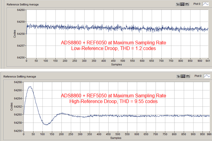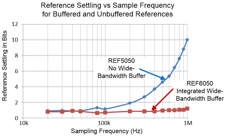 下圖比較了具有和不具有寬帶寬基準(zhǔn)緩沖器時(shí) ADC 的失真。請(qǐng)注意,在高采樣速率條件下,具有寬帶寬緩沖器的 ADC 具有明顯更高的 THD 性能。在低采樣速率條件下,緩沖器不太重要,因?yàn)榛鶞?zhǔn)有很長(zhǎng)的時(shí)間來(lái)從基準(zhǔn)瞬態(tài)中恢復(fù)。