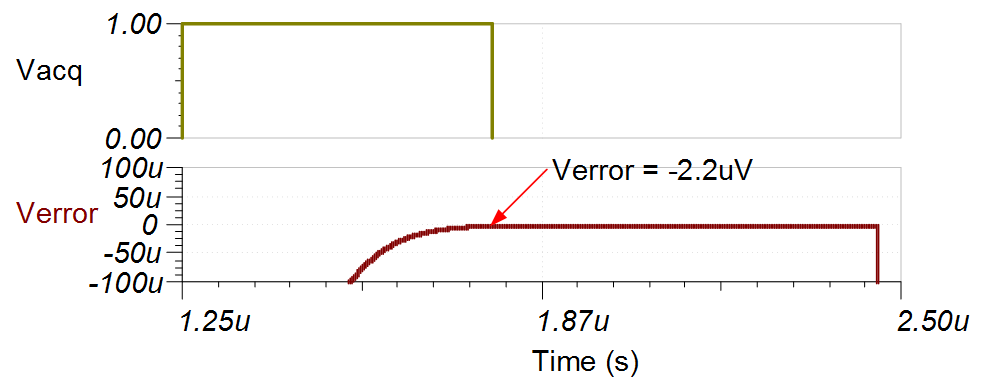 以下仿真顯示了穩(wěn)定至 –10V 直流輸入信號的情況。該類型的仿真表明已正確選擇采樣保持反沖濾波器。有關該主題的詳細理論,請參閱最終 SAR ADC 驅動器仿真 視頻。注意:在此示例中,放大器存在穩(wěn)定問題,因此采樣速率從 1MSPS 降至 800kSPS。降低采樣速率會增加采集周期以改善穩(wěn)定性能 (tacq = 1 / fsamp – tconv = (1/800kSPS) – 710ns = 540ns)。